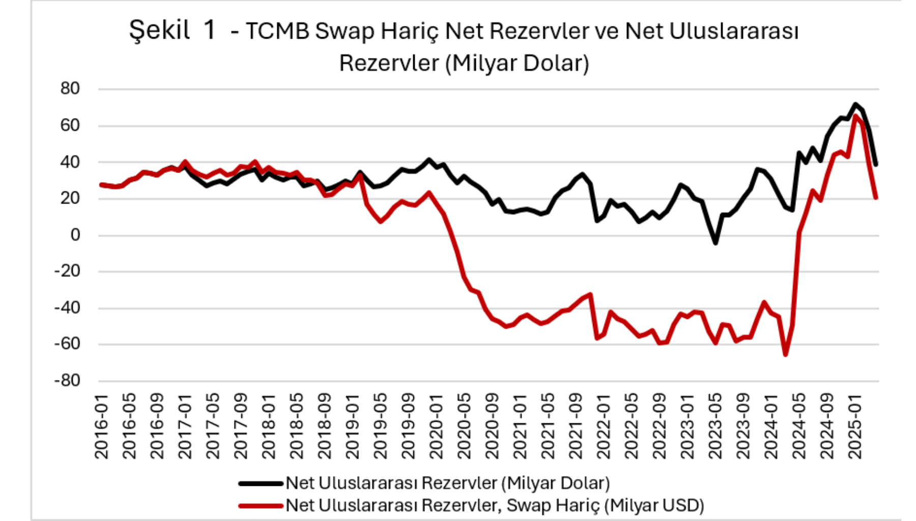 19 Mart 2025 öncesi kurun yükselmemesinin sebebi yaşanan dolar bolluğudur. Carry-trade ile giren sıcak para, yabancı para mevduatların TL’ye döndürülmesi, KKM’de yaşanan erime, dolar arzını besleyen olgular olmuştur. Bu ortam Merkez Bankasına, 2018 başlangıçlı krizde eksi 65 milyar dolara kadar inen swap hariç net rezervini, yerel seçimler sonrası tekrar inşa etme şansı tanımıştır. 19 Mart sonrası derinleşen kriz ortamının körüklediği kur artışını engellemek amacıyla Merkez Bankası yeniden dövize müdahaleye başlamış, bu nedenle büyük rezerv kaybına uğramıştır (bkz. Şekil 1).