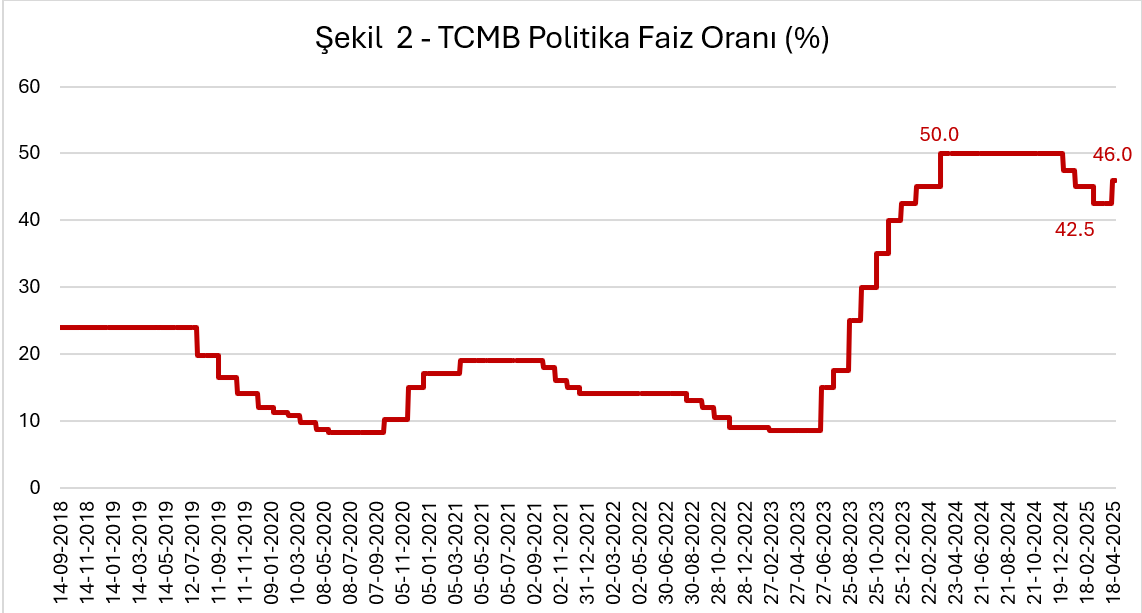 TCMB, 17 Nisan 2025 tarihli Para Politikası Kurulu kararı ile politika faizini 350 baz puan artışla yüzde 42,5’tan yüzde 46’ya yükseltmiştir (bkz. Şekil 2). Burada amaç bir yandan dövize yönelmeyi önlemek, bir yandan da carry-trade getirisini arttırarak ülkeye kısa vadeli döviz girişini özendirmekti. Politika faizi yanında gecelik faiz de 300 puan artışla yüzde 49’a, gecelik vadede borçlanma faizi ise yüzde 44,5’e yükseltilmiştir. Bunlara paralel olarak üç aya kadar vadeli mevduat faizleri de yüzde 55,7’ye kadar yükselmiştir. Doğal olarak kredi faizlerinin de yükselmesi söz konusudur. Yüzde 55 faiz ile 1 yıl vadeli, 3 ayda bir faiz ödemeli bir kredinin şirkete gerçek maliyetinin yüzde 70’in üzerinde olduğu ifade edilmektedir. 19 Mart operasyonu olmasaydı Merkez Bankası’nın 17 Nisan toplantısında politika faizini yüzde 42,5’ten yüzde 40’a düşürmesi bekleniyordu.