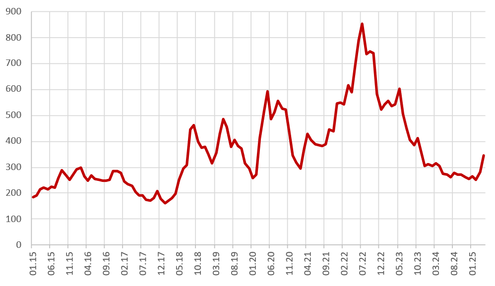 Şekil 3- CDS (5 yıllık, aylık ortalama, baz puan)