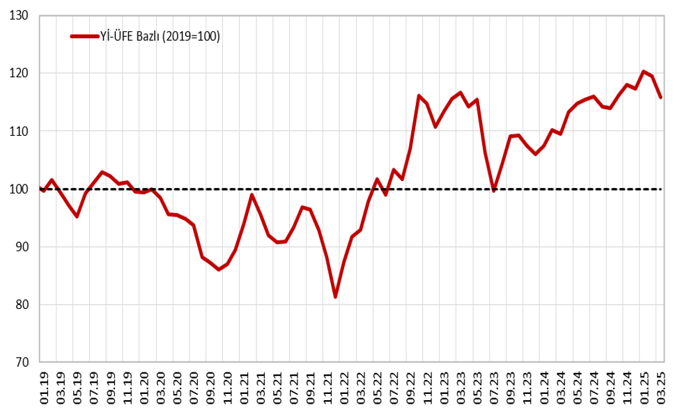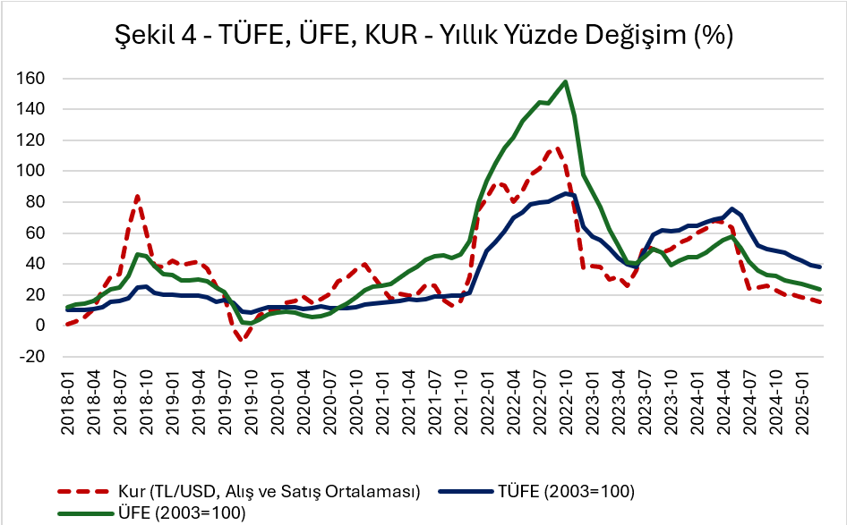 TUİK’in enflasyon rakamları, TÜFE’nin Ekim 2022’de yüzde 85,5’ten Temmuz 2024’te 61,7’ye, Mart 2025’te ise yüzde 38’e düştüğünü göstermektedir. Benzer şekilde ÜFE Ekim 2022’de yüzde 157 iken Temmuz 2024’te yüzde 41,4’e, Mart 2025’te ise yüzde 23,5’e düşmüştür (bkz. Şekil 4). TUİK’in enflasyon rakamlarının tartışmalı olduğu ifade edilmekte. ENAG ve İTO’nun enflasyon rakamları daha yüksek seyretmekle birlikte onlarda da dezenflasyon sürecinin başladığı görülmekte.