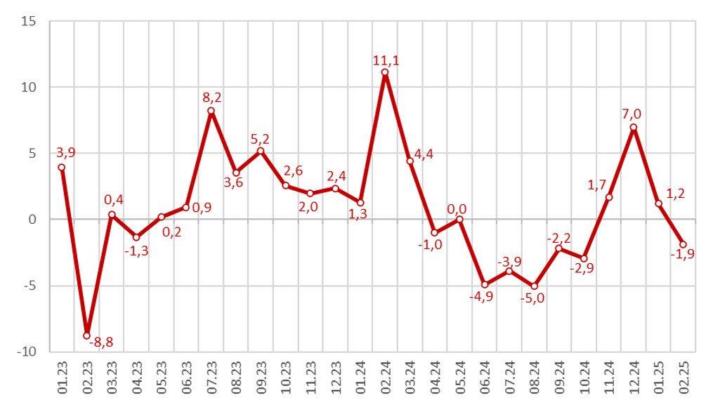 TÜİK verilerine göre sanayi üretimi bir önceki yılın aynı ayına göre Nisan 2024’ten Ekim 2024’e kadar düşme eğilimi göstermiştir (bkz. Şekil 5). Sanayi üretiminde görülen azalma/yavaşlama ikinci çeyrekten itibaren GSYH büyüme hızına da yansımaya başlamıştır. Nitekim 2024’ün ilk çeyreğinde yüzde 5,4 olan GSYH yıllık büyümesi; ikinci çeyrekte yüzde 2,4, üçüncü çeyrekte yüzde 2,2, dördüncü çeyrekte ise yüzde 3,0 olmuştur. Böylelikle 2023 yılında yüzde 5,1 büyüyen Türkiye ekonomisi, 2024 yılının ikinci çeyreğinden itibaren yavaşlayarak yılı %3,2 büyüme ile tamamlamıştır. Nisan 2025’te yükseltilen politika faizi paralelinde artan kredi faizlerinin ve son dönemde ticaret politikalarına bağlı olarak artan küresel belirsizliklerin sanayi üretimini olumsuz etkilemesi beklenmektedir. Türkiye’de 2024’ün ikinci çeyreğinde başlayan yavaşlamanın, 2025 yılında daha ciddi boyutta devam edeceğini tahmin ediyoruz. IMF’nin 2025 yılı için büyüme tahmini yüzde 2,7’dir. Önümüzdeki 5 yıl için ise Türkiye’nin büyüme ortalamasını yüzde 3,4 olarak tahmin etmiştir.