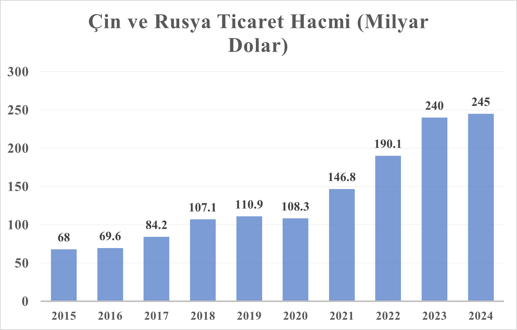 Batı’nın Rusya’ya karşı artan yaptırımları sebebiyle, Rusya’nın enerji alanında Avrupa pazarlarından bir nevi tecrit edilmesi, Rusya’nın Çin ile arasındaki enerji ticareti ilişkilerini bambaşka bir noktaya taşımıştır. 2022 yılı itibariyle Çin, Rusya’nın en büyük petrol ve doğalgaz alıcısı haline gelmiş ve iki ülkenin ticaret hacmi 190 milyar doları aşmıştır (von Essen, 2023). Bu artan ticaret hacmi 2023 ve 2024 yıllarında sırasıyla 240 ve 245 milyar dolara ulaşmıştır. Bu süreçte Çin, Rusya ile yaptığı anlaşmalarda daha uygun fiyatlarla enerji alımını uzun vadede garanti altına almıştır (Rusya’nın içinde bulunduğu durumdan yararlandığı da söylenebilir).