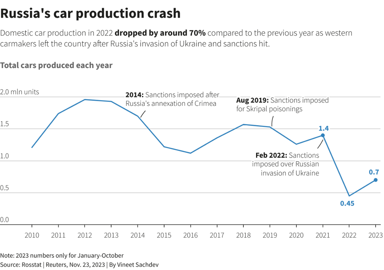 Stolyarov, G., & Marrow, A. (2023, November 24). Chinese car sales boom in Russia levels off amid shaky local recovery. Reuters. https://www.reuters.com/business/autos-transportation/chinese-car-sales-boom-russia-levels-off-amid-shaky-local-recovery-2023-11-24/