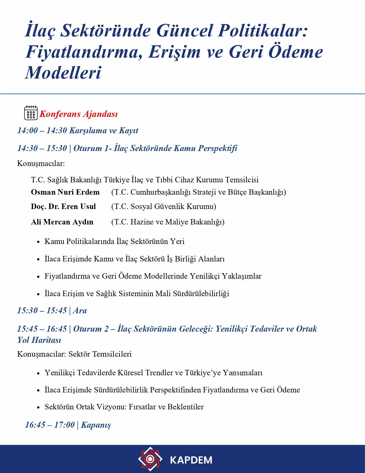 Kamu Politikası, Devlet Yönetimi ve Toplumsal Gelişim Merkezi (KAPDEM) olarak, 8 Ocak 2026 tarihinde Wyndham Ankara’da düzenleyeceğimiz “İlaç Sektöründe Güncel Politikalar: Fiyatlandırma, Erişim ve Geri Ödeme Modelleri” başlıklı zirve; ilaç sektöründe kamu politikalarının güncel dinamiklerini ve geleceğe yönelik dönüşüm alanlarını kapsamlı biçimde ele almak üzere gerçekleştirilecektir.