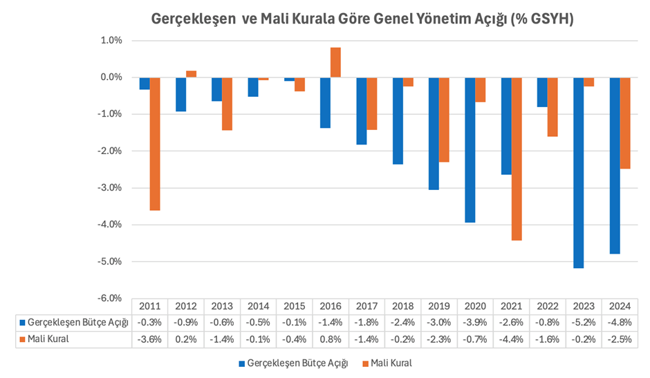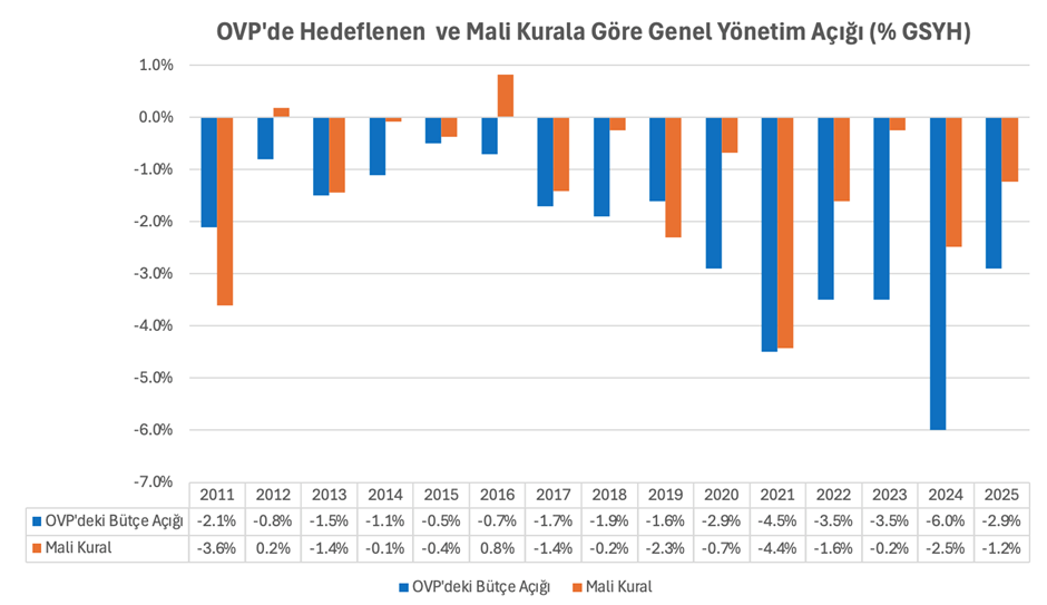 2010 yılındaki Mali Kural Kanun Tasarısı yasalaşmış olsaydı 2011 yılından geçerli olacak şekilde genel yönetim bütçe dengesinin yukarıdaki formüle göre hesaplanması gerekecekti. Ancak muhtemelen Kanun Tasarısının yasalaşacağı beklentisine göre belirlenmiş olan 2011 yılındaki Orta Vadeli Program (OVP) hedefinin 2012 yılında mali kurala göre bütçe fazlası verilmesi gerekirken OVP’de GSYH’nin 0,8’i düzeyinde bir açık programlanmıştır. İzleyen yıllarda birkaç yıl dışında genel olarak mali kurala göre hesaplanan genel yönetim bütçe açığı ile OVP ile belirlenen hedef arasında mali disiplinden uzaklaşma yönünde önemli sapmalar bulunmaktadır. Mali kural ve OVP arasındaki farklar bazı yıllarda ise oldukça dikkat çekicidir. Nitekim 2016 yılında mali kurala GSYH’nin yüzde 0,8’i kadar bütçe fazlası verilmesi gerekirken yüzde 1,4’lük açık planlanmıştır. Özellikle pandemi sonrası dönemde de tasarıdaki mali kurala göre hesaplanan açıkla OVP’de belirlenen rakam arasındaki fark önemli büyüklüklere ulaşmıştır. Hatta 2023 yılında heterodoks politikaların terk edilerek geleneksel yaklaşıma geçildikten sonra hazırlanan 2024 yılı bütçesinde öngörülen yüzde 6’lık açık mali kurala göre hesaplanan yüzde 2,5’in oldukça üzerindedir. Benzer şekilde 2025 yılı için de OVP’de hedeflenen açık yüzde 2,9’ken mali kurala göre olması gereken açık GSYH’nin yüzde 1,2’si kadardır.